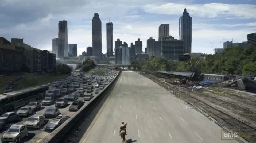 Gdy nieumarli powstali, rząd i wojsko poradziły ludziom, aby szukali ochrony w większych miastach, ale nie byli w stanie poradzić sobie z tragiczną sytuacją. Wojsku nie udało się powstrzymać zarażonych, w wyniku czego większość populacji ożywiła się jako nieumarli. Wojskowe punkty kontrolne zostały opanowane, a pojazdy spalone lub porzucone. Ludzie próbowali uciekać z miasta za pomocą autostrad, jednak zostali zablokowani, pozostawiając pasażerów pojazdów podatnych na 'szwendaczy'. Budynek Centrum Kontroli Chorób mieści się również w Atlancie i próbował odkryć lekarstwo na wybuch apokalipsy. Kiedy miasto zostało opanowane, a personel wojskowy został zainfekowany, wywołano naloty, uwalniając napalm na ulice miasta. Niemniej jednak, nie byli oni skuteczni w oczyszczaniu miasta z nieumarłych i większość miasta pozostała nienaruszona, ponieważ celowano tylko w ulice zainfekowanych (co tłumaczy, dlaczego kiedy Rick Grimes wszedł do miasta, zobaczył kilka spalonych pojazdów). Wraz z miastem opanowanym przez nieumarłych, obrzeża Atlanty stosunkowo były względnie bezpiecznie, dopóki szwendacze nie zaczęli powoli wychodzić na bardziej wiejskie tereny w poszukiwaniu jedzenia.