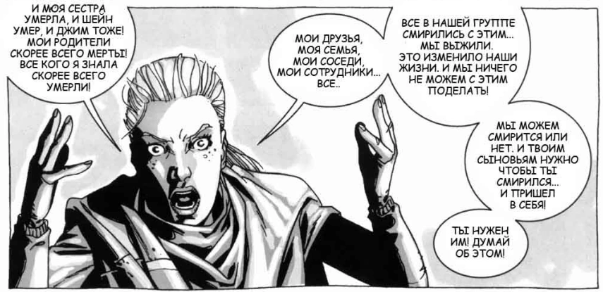 | “ | Я замкнулась, когда потеряла Эми. Днями не разговаривала... Не могла думать... И почти сошла с ума. Все, кого я знала, скорее всего, умерли! Все в нашей группе смирились с этим. Это изменило наши жизни. | ” |
