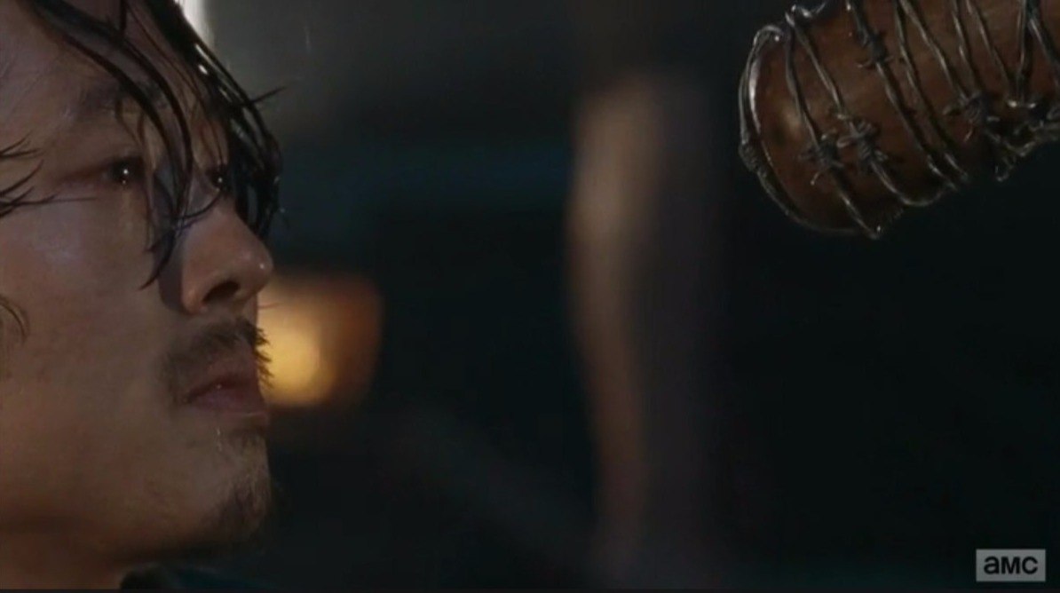 Ниган подходит к Дэрилу и говорит Рику, что никаких исключений не может быть, что он предупреждал... и со всего маху бьёт по голове Гленна, а затем повторяет удар. Гленн, истекая кровью, в агонии смотрит на Мэгги и из последних сил произносит «Мэгги, я найду тебя». После чего Ниган продолжает жестоко ломать череп и разрывать плоть Гленну своей битой, а затем подшучивает над происходящим. Далее Ниган подходит к Рику и спрашивает: «Что, шутка была такой несмешной?»