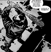 Cпасители и их лидер - Ниган, устраивают засаду для группы Рика. Ниган использует Люсиль для того, чтобы жестоко убить Гленна в отместку за убитых ранее спасителей. В 113-м выпуске Карл стреляет в Люсиль. Ниган в ярости требует, чтобы Карла сбросили со стены. Выжившие отказываются и Ниган угрожает убить с помощью Люсиль Рика, Хита, Николаса и Холли.