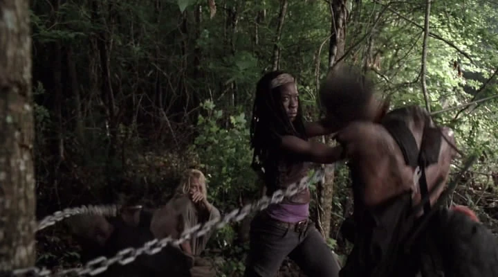 Однажды ночью Мишонн увидела, как зомби напали на обессиленную женщину, у которой закончились патроны в пистолете. Она спасла её, зарубив ходячих, хотя её собственный вид - в капюшоне, с мечом и парой зомби на цепях, казалось, напугал женщину ещё больше, чем ходячие.