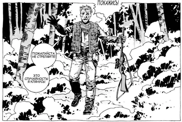 | “ | Я мухи не обижу... В смысле я и раньше бывал на охоте, но никогда не убивал зверей, которых не стал бы есть. Я спокойный. Не люблю насилие. Я понимаю, почему Рик хотел убить меня. Если бы я убил мальчика, я бы хотел, чтобы он меня убил. Я бы заслужил это. | ” |