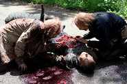 По рации Гленн передаёт Рику свой план, когда тот борется с группой ходячих и ранит руку.