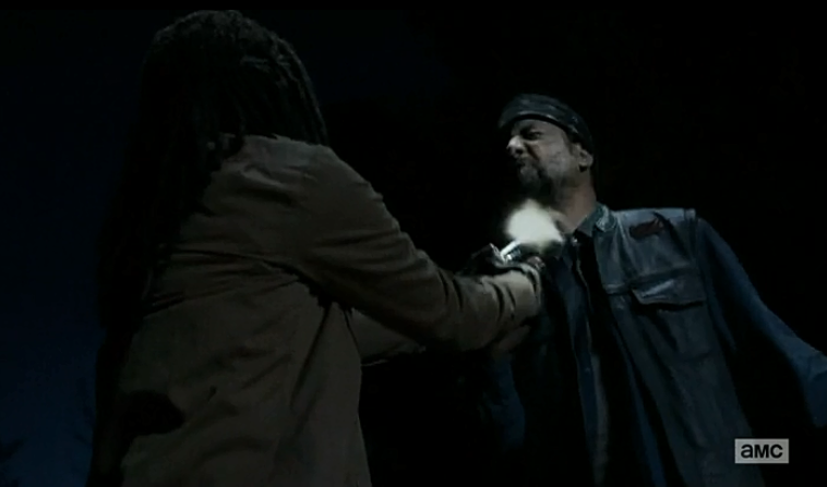 Мародёры нападают на Рика, Мишон и Карла. Тони держит Мишон на прицеле. Когда Рик перегрызает Джо горло, Тони на мгновение снижает бдительность из-за шока и этим пользуется Мишон. Она направляет его пистолет на него самого и стреляет убив его на месте («А»).