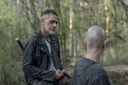 Альфа и Ниган обмениваются ударами прутиков в знак взаимной симпатии, а затем идут бок о бок во главе многотысячного стада ходячих под тяжёлым ревнивым взглядом Беты.