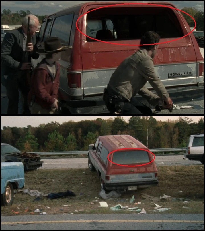 - Вернувшись на Шоссе с автомобильным затором, группа Рика укрылась за красным джипом, у которого было видно явное отсутствие заднего стекла. Чуть позже, после угона джипа, стекло вдруг появилось на своём месте.