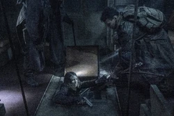 Back at the subway, Daryl finds a bag with some food in it. Upon inspection, he discovers a note scribbled on a one-hundred-dollar-bill, left by a boy to his father. He also finds a picture of the boy, Tom, and his sister, Jesse. Dog discovers a walker in a sleeping bag, so Daryl puts it down. It is then that he notices a map of the subway on the wall above. Suddenly, a loud noise is heard followed by a scream. Chasing after it, Dog jumps into a pipe, forcing Daryl to crawl in after him.