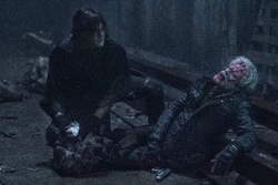 After retrieving Roy, Maggie's group finally makes it to the surface. Negan dutifully hands Maggie her gun back, while Daryl looks over the note he found. Agatha asks if they'll be heading out, but Maggie says they'll take a detour first to Arbor Hills, where there is a hidden supply depot set up by Georgie. She asks Negan if he knows where that is, and he confirms it, offering to lead the way. Upon arriving to their location, the group is alarmed by the sight of bodies strung up all along the road they're on. Suddenly, the group is showered with arrows and throwing knives, killing Roy and severely injuring Cole. As the group scrambles for cover, they see a group of Reapers advancing towards them.