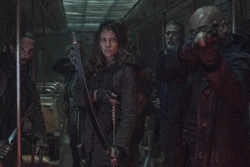 Frost and Duncan finally manage to pry open the door, but find the next one blocked. The door holding back the walkers, meanwhile, begins to give way. Duncan desperately tries to smash the door of the front car down, while the rest of the group gets ready to fight the walkers. The door to the rear car finally breaks under the horde's mass, and walkers begin to descend on the survivors, led by a zombified Gage, who is quickly put down by Gabriel. Using the tactics that the Coalition had developed to fight Alpha's horde, the group desperately begins fighting off the walkers. In the tunnel, Daryl hears the gunshots and rushes to the survivors' aid. Despite the group's valiant defense, the horde slowly advances. Meanwhile, having made a small gap in the door, Duncan discovers that walkers are coming from the front car as well. Out of necessity, Maggie hands Negan her pistol, which he uses to fend off zombies from the front car. Meanwhile, Daryl sneaks up behind the walkers in the front car and begins to dispatch the walkers with Roy's pistol. Out of ammo, the survivors must resort to melee weapons. Luckily, Daryl reaches the blocked door in time and is able to open it. Once everyone's inside, he shoves a grenade into a walker's mouth and pushes it into the horde before slamming the door shut and taking cover. In the ensuing explosion, the remaining walkers are killed.