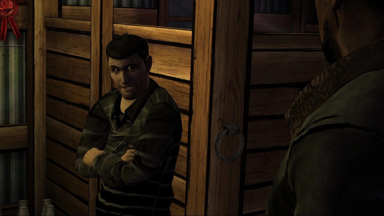 After unsuccessfully searching for the Bandits with Danny, Lee returns and finds out that Kenny is growing suspicious about a locked room in the back of the barn, thinking the St. Johns might be hiding something there. Andrew notices their interest in the room, and Lee can question him more or less directly about it, but he just claims there are tools in it and that it is locked to keep the bandits from getting their hands on them. Determined to find out what is in the room, Lee distracts Andrew by sabotaging the generator and removing the lock with a multi-tool. Just as he opens the doors, revealing a bloody slaughter room, Andrew returns and tells him to come to dinner, easily explaining away the state of the room as being where they skin and dress animals.