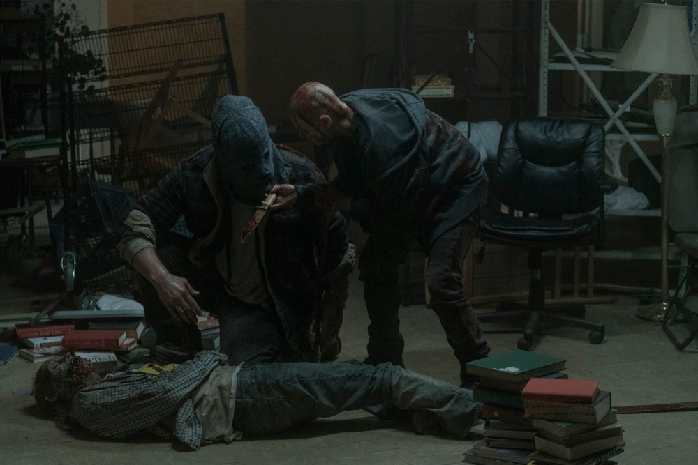 Alpha, after seeing that this zombified man is about to bite Beta, stabs him in the head, putting him down.