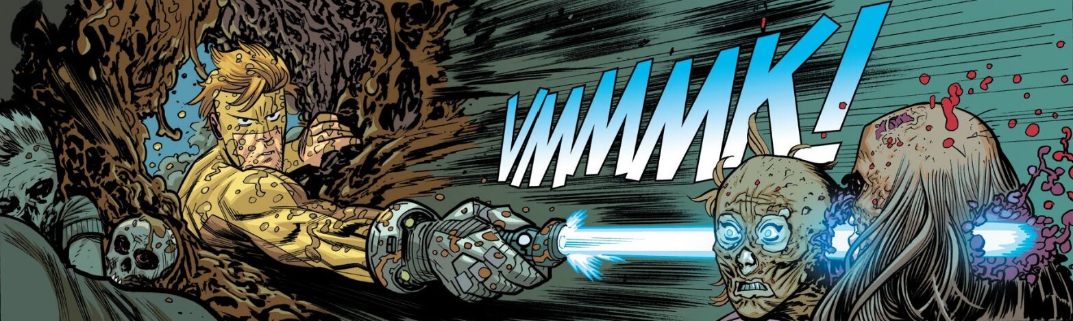 After Rick surfs his way up to Alpha and Beta's colossal zombie, he cuts his way through to find Alpha and Beta, then simultaneously stabs them through the head.