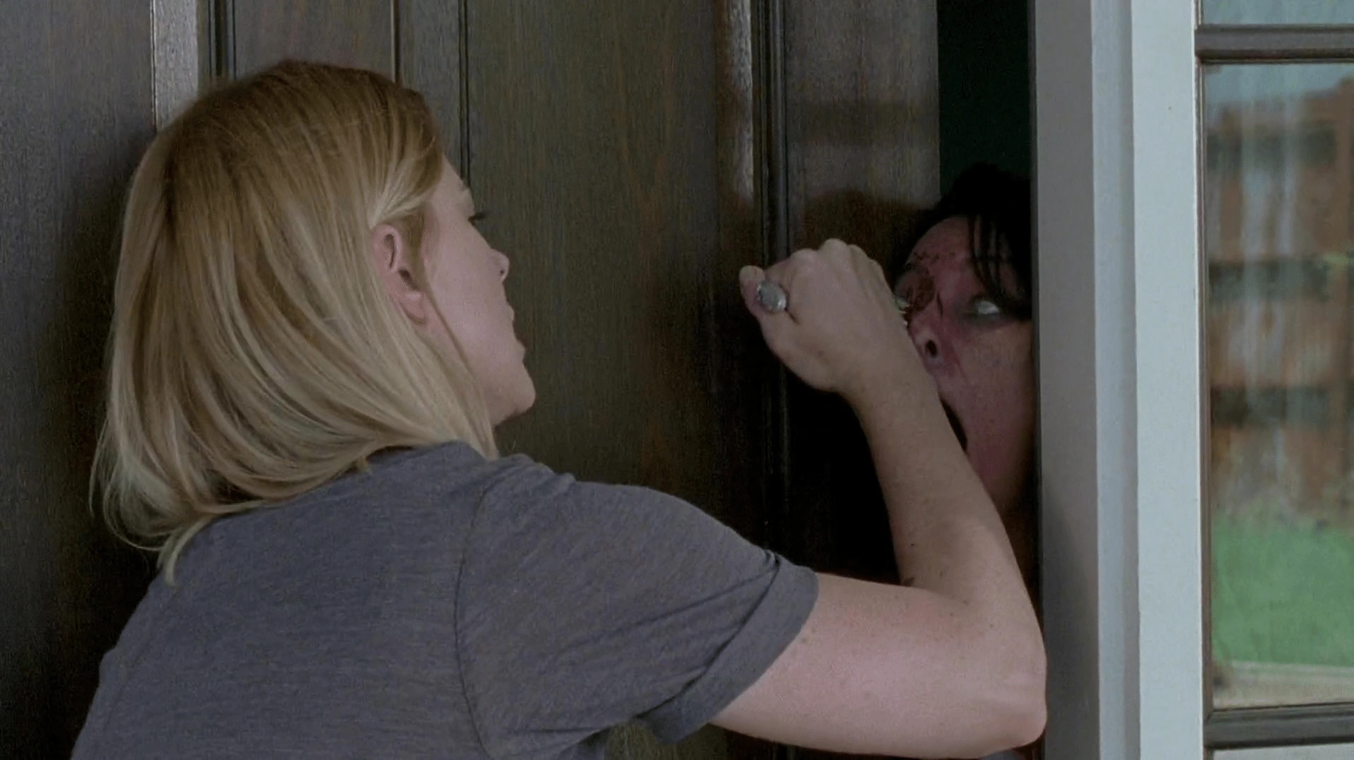 Jessie finds a reanimated Betsy in her home and puts her down by stabbing her in the eye.
