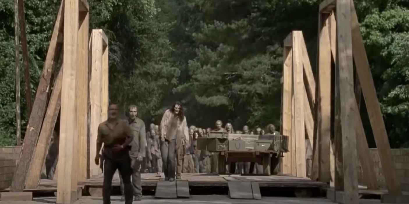 In the woods, Michonne talks to Rick's presence at the destroyed bridge about the future and how life continues. The bridge has not been rebuilt in the six years since its destruction and it continues to lie in ruins.