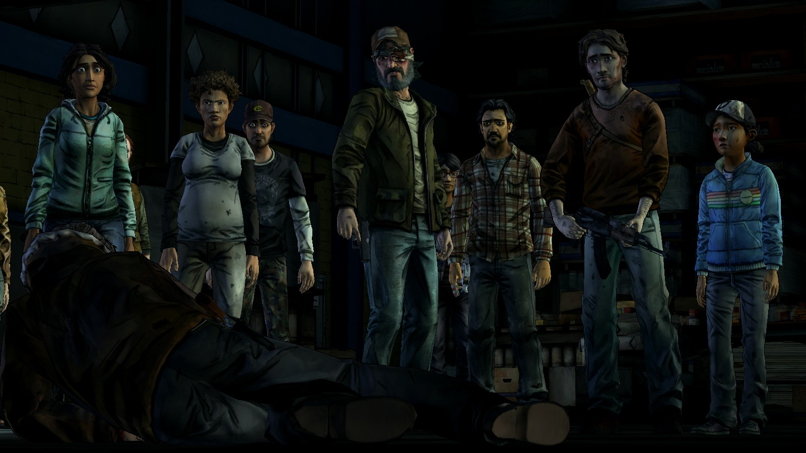 Now that they are outside of the store, the group has the approaching herd of walkers to contend with. Luke hands Clementine a hatchet. She then kills a nearby walker and cuts it open, smearing herself and Sarah with the guts. Everyone else in the group does the same. They then begin walking through the herd, unnoticed due to the guts. But chaos breaks loose as the remaining members of the community at the hardware store open fire on the herd. Carlos is shot in the neck by a stray bullet and is then immediately set upon by walkers, dying instantly. This causes Sarah to begin screaming and running off, and Luke chases after her. Nick, if he survived until now, is shot in the shoulder, but continues after Luke. Sarita's arm gets grabbed by a walker and is bitten on the hand, and she is unable to free herself. Clementine has the option of axing the walker in the head, or chopping off Sarita's arm at the elbow.