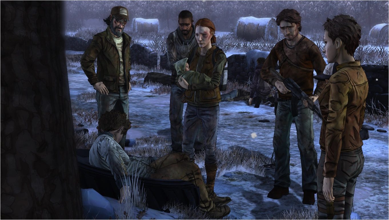 As the group walks down a road during a snowy day, Rebecca is visibly struggling to continue on. Kenny and Luke begin arguing about turning back, and Rebecca eventually collapses. They take a break, sitting Rebecca down in a discarded tire. As they are debating about what to do, they notice Arvo approaching them down the road. Clementine informs the group who he is. As Arvo talks to them, he serves as a distraction for his Russian compatriots to emerge from the brush and hold the group at gunpoint. Arvo tells the group to put down their weapons and let them have the group's belongings. The group refuses, bringing out their own weapons, and a standoff occurs. Arvo notices that Jane is not present, and assumes she is going to spring a trap. Clementine denies this, saying she left the group, but he does not believe her. Clementine then notices that Rebecca has died, and is about to reanimate as a walker with the baby still in her lap. Clementine has the option of shooting Rebecca in the head, or calling out for help, which will cause Kenny to shoot Rebecca instead. Regardless, this causes the Russians to open fire, throwing the scene into chaos.