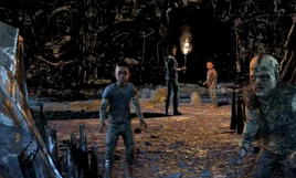 After managing to slightly outpace a herd, Clementine, Alvin Jr. and Tennessee locate a cave and decide to enter it in order to escape the herd. If James had survived the previous episode, he appears outside of the cave states that he saw bloodlust in AJ's eyes as he killed Lilly. Through the cramped confines of the entrance, the walkers are temporarily unable to follow them when two of them accidentally enter at the same time and block the rest.