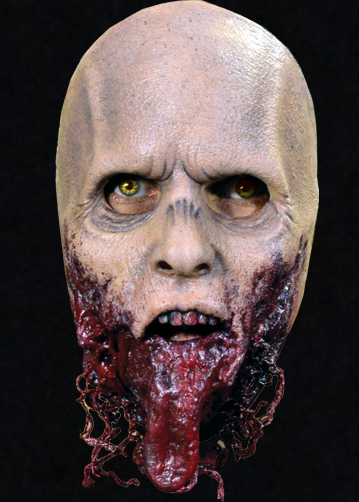 The Jawless Walker is a highly detailed face mask that includes a split jaw with hanging tongue and shreaded flesh that dangles from the mask. It was sculpted by Neal Kennemore, the artist that sculpted a number of The Walking Dead Walkers for Universal Studios Halloween Horror Nights - The Walking Dead Maze, using hundreds of screen references.[5]