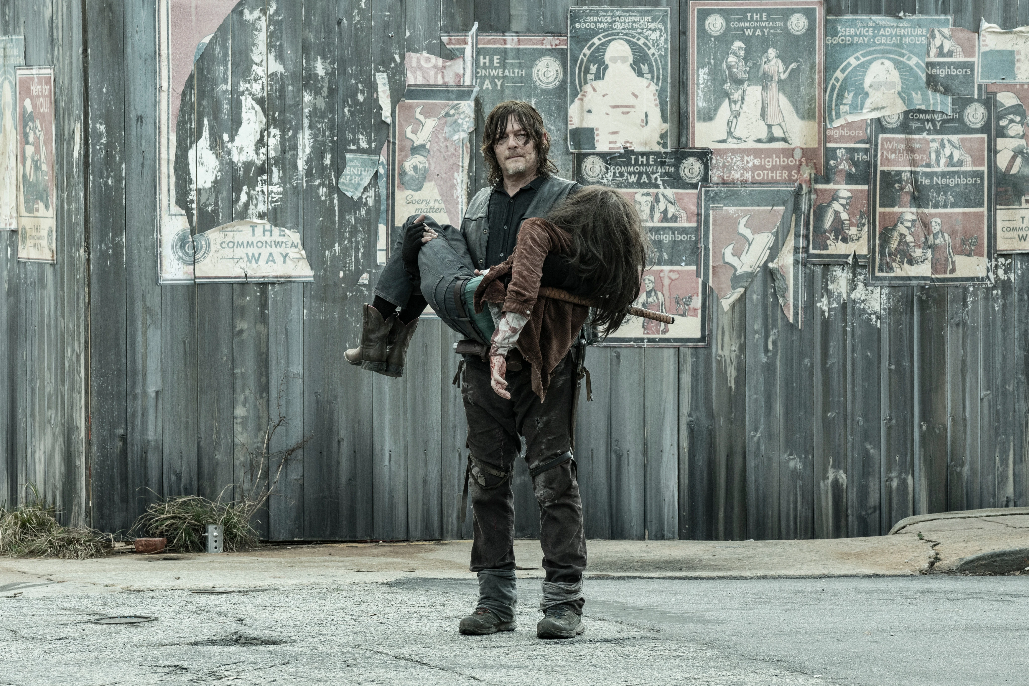 The Coalition races through the streets towards the hospital with Daryl carrying the unconscious Judith. Commonwealth vehicles drive up and block their path in multiple directions, forcing them to fall back. Carol realizes that the soldiers aren't following them as they begin to erect barricades in the streets. Loudly yelling and firing their guns in the air, Commonwealth soldiers lead the herd in their direction before closing the barricades, penning the herd and the Coalition in. Spotting a walker climbing over something, a shocked Negan asks "what the fuck?" As walkers close in from multiple directions, Luke and Jules emerge from the herd, causing Kelly to nearly shoot them before Connie stops her sister. Fleeing down a side street, Carol spots an alley near part of the herd and everyone attacks the walkers, clearing a path for Daryl to flee down the alley towards the hospital with Judith. Waking up for a moment, Judith calls out "daddy?" and witnesses her friends and loved ones struggling to hold back the herd before passing out again.