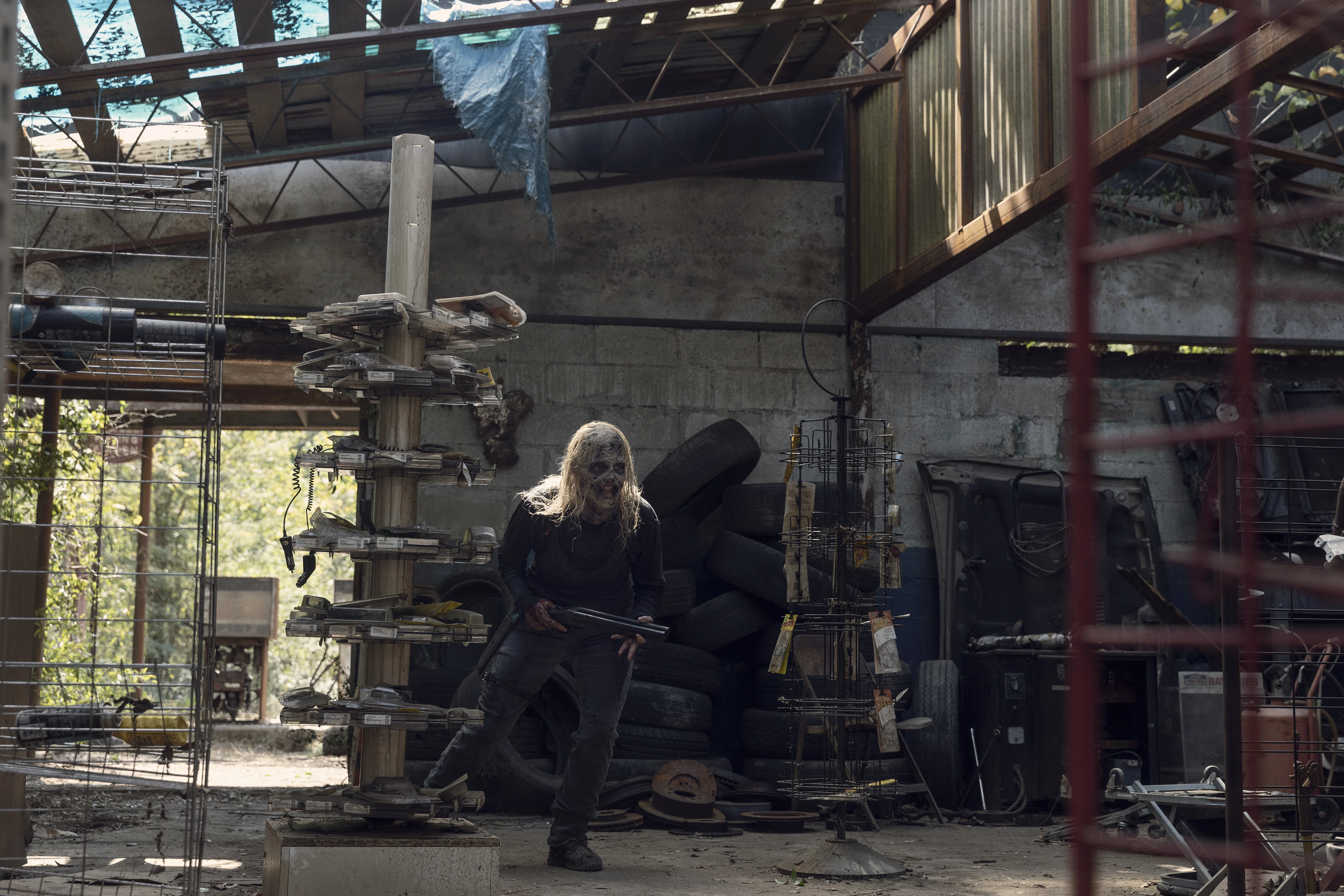 After a fight with Daryl, a weakened Alpha stumbles into this abandoned gas station where Daryl is hiding and is struggling to pull out the knife from his leg. She looks for him in the workshop inside the station for a short time, but after getting exhausted takes a seat and bangs her shotgun on the wall to attract walkers in the vicinity which will protect her and attack Daryl. Three walkers are lured inside by Alpha, so Daryl's forced to kick off a fire extinguisher and use it as a weapon. He kills two but has to rip the knife from his leg to kill the third, thus opening his wound and losing a lot of blood.