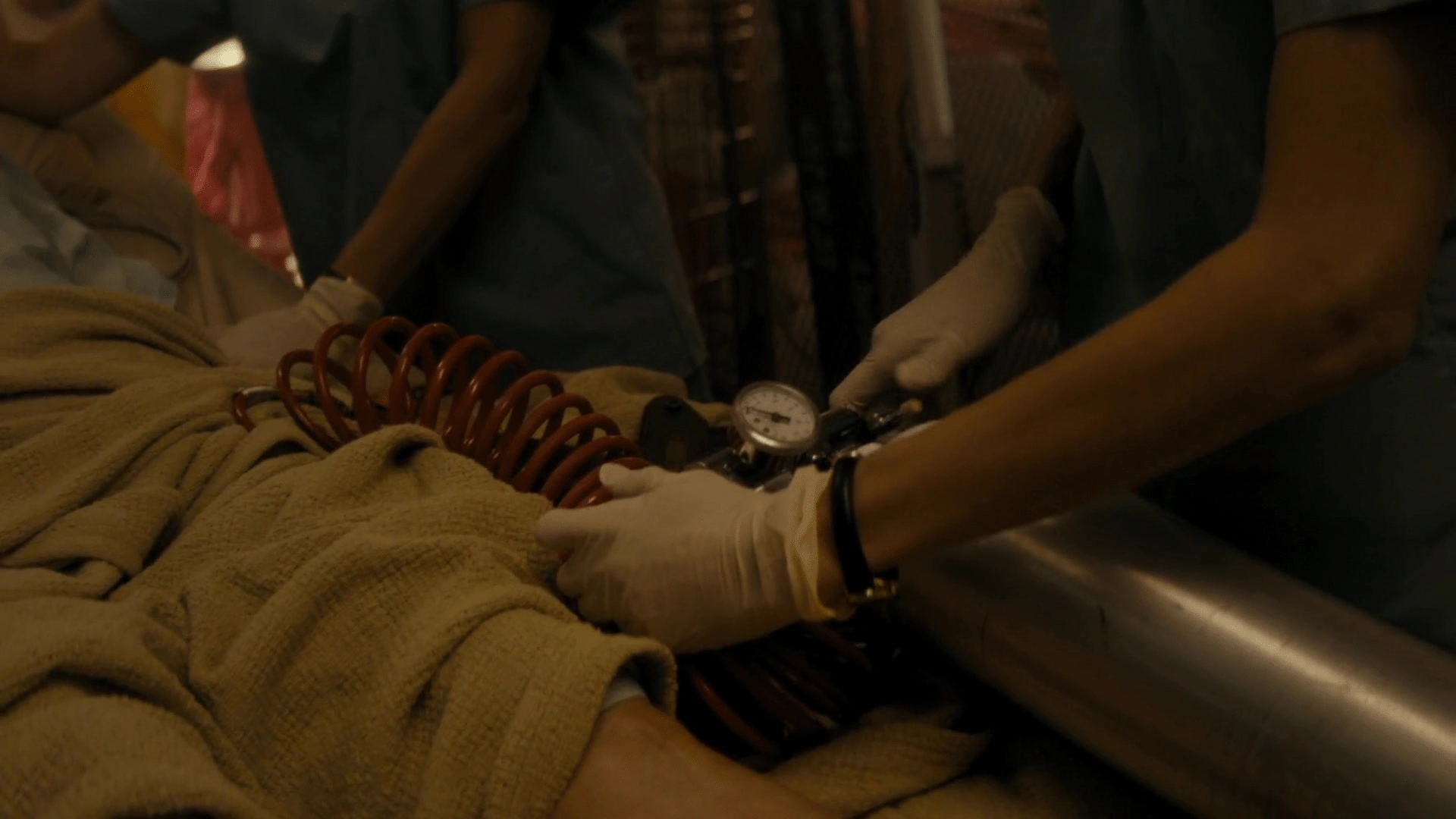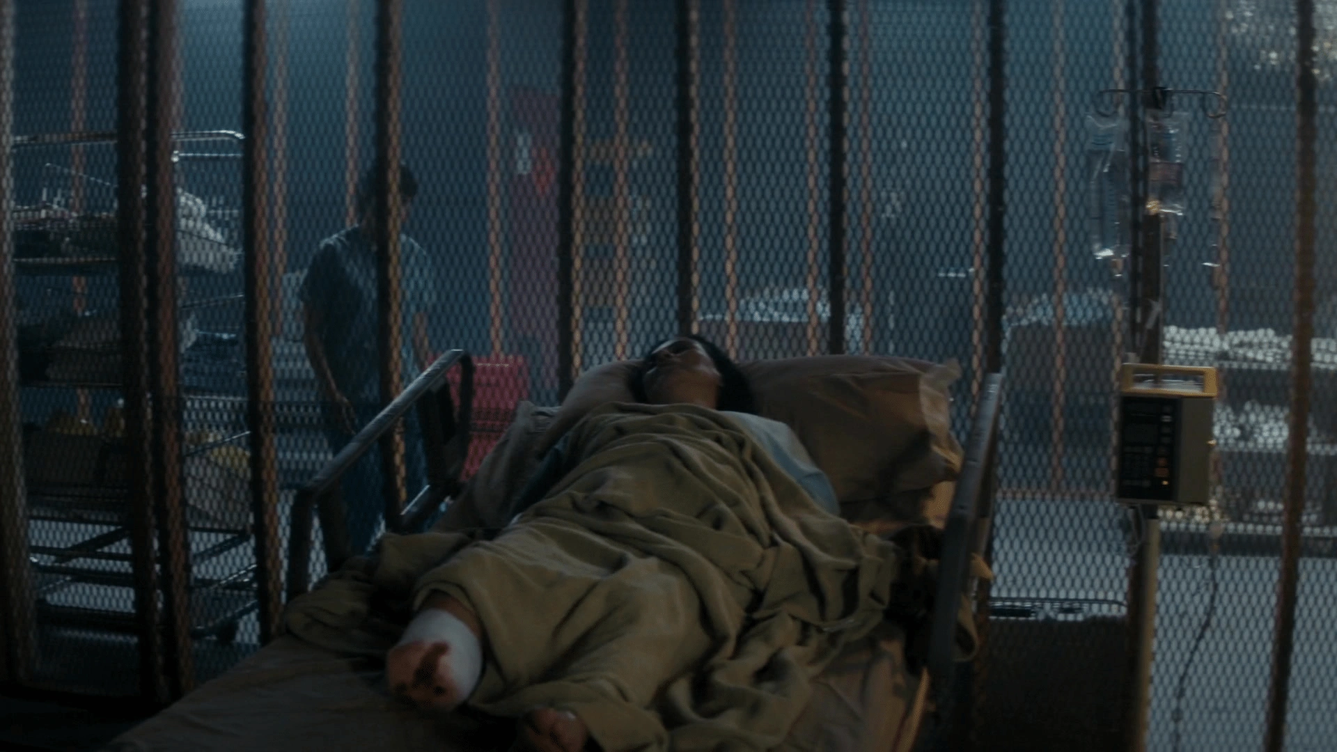 As Travis, Liza, Chris, and the Salazars leave the Salazar's barbershop, they proceed towards Travis' truck to get out of the riot. They pass through a scaffolding where riot officers blast a high-pressure hose on rioters on top of a scaffolding, collapsing it, pinning Griselda's leg, and severely injuring her foot.