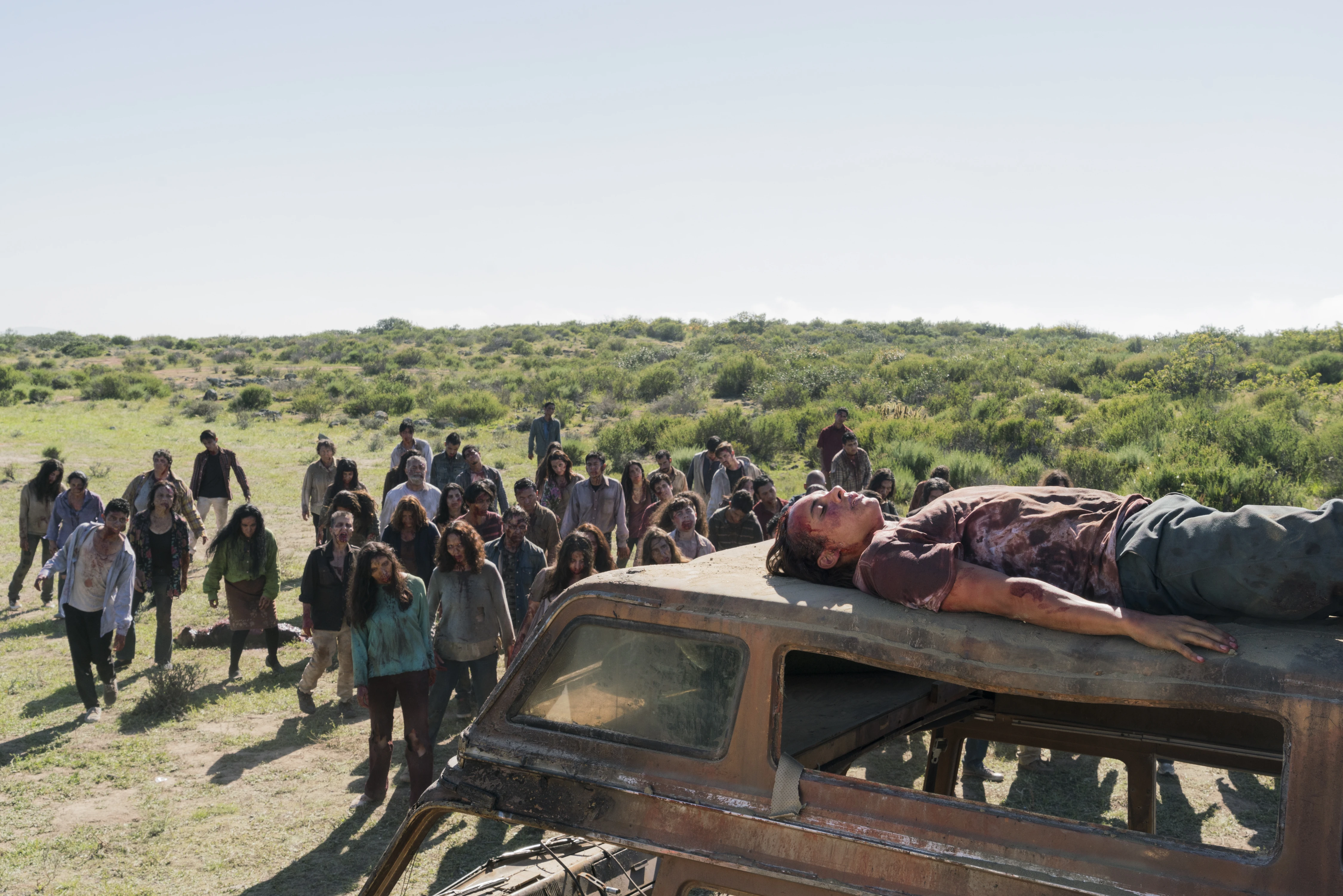 Nick rests on top of the van and inspects his leg wound, which is deep. The herd hears him move and swarms the van. He closes his eyes and prays. A vehicle horn sounds in the distance and the herd flocks towards it. Seizing the opportunity, Nick crawls off the van and eats meat from one of the dog carcasses. He removes the belt from a maimed infected and ties his injured leg with it.