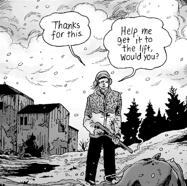Helen brings Clementine and Amos to Killington, Vermont and Amos gets ready to leave Helen with Clementine, when they are met by two of it's residents, twin Georgia and Olivia. Helen is unexpectedly shot and killed by Olivia, who believed her to food.