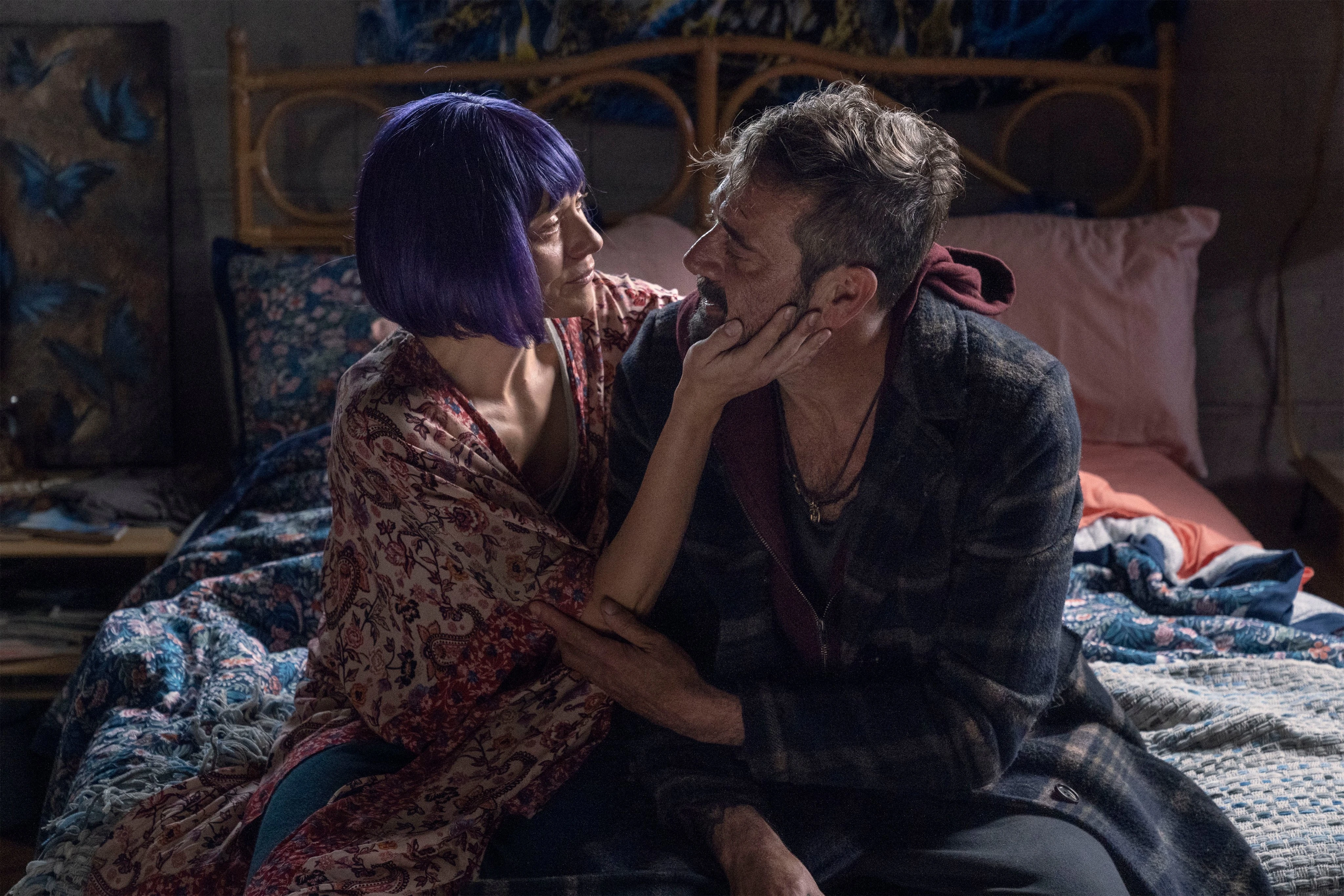 As Lucille opens a can of dog food, Negan is dismayed to hear yet another walker outside. Lucille insists that it's not like killing a person or even an animal, and Negan can't keep letting it bother him. He states that it doesn't bother him, but he is just worried that he will get used to it. She has him turn the generator off. The couple enjoy their dinner and Lucille hands him a bag containing an anniversary gift, even though she doesn't know what day it is. To his surprise and pleasure, Negan pulls out his signature leather jacket, which she admits to having kept in the crawlspace; she was angry that she hadn't been able to return it to the store. Negan is ecstatic and Lucille apologizes for making such a big deal out of the credit card bill for the jacket, stating that she wouldn't have made such a big deal out of it if she'd known that the world was going to end. Negan insists that he doesn't deserve anything from her and it should be him apologizing to his wife, not the other way around. He says that he lays awake at night wondering how he got so lucky she stuck with him after the pain he put her through. Sitting in her husband's lap, Lucille tells him that she stuck with him because she could always see the man he is right now "even when you weren't" and that "that asshole really had it coming." She convinces her husband to smoke the pot with her.