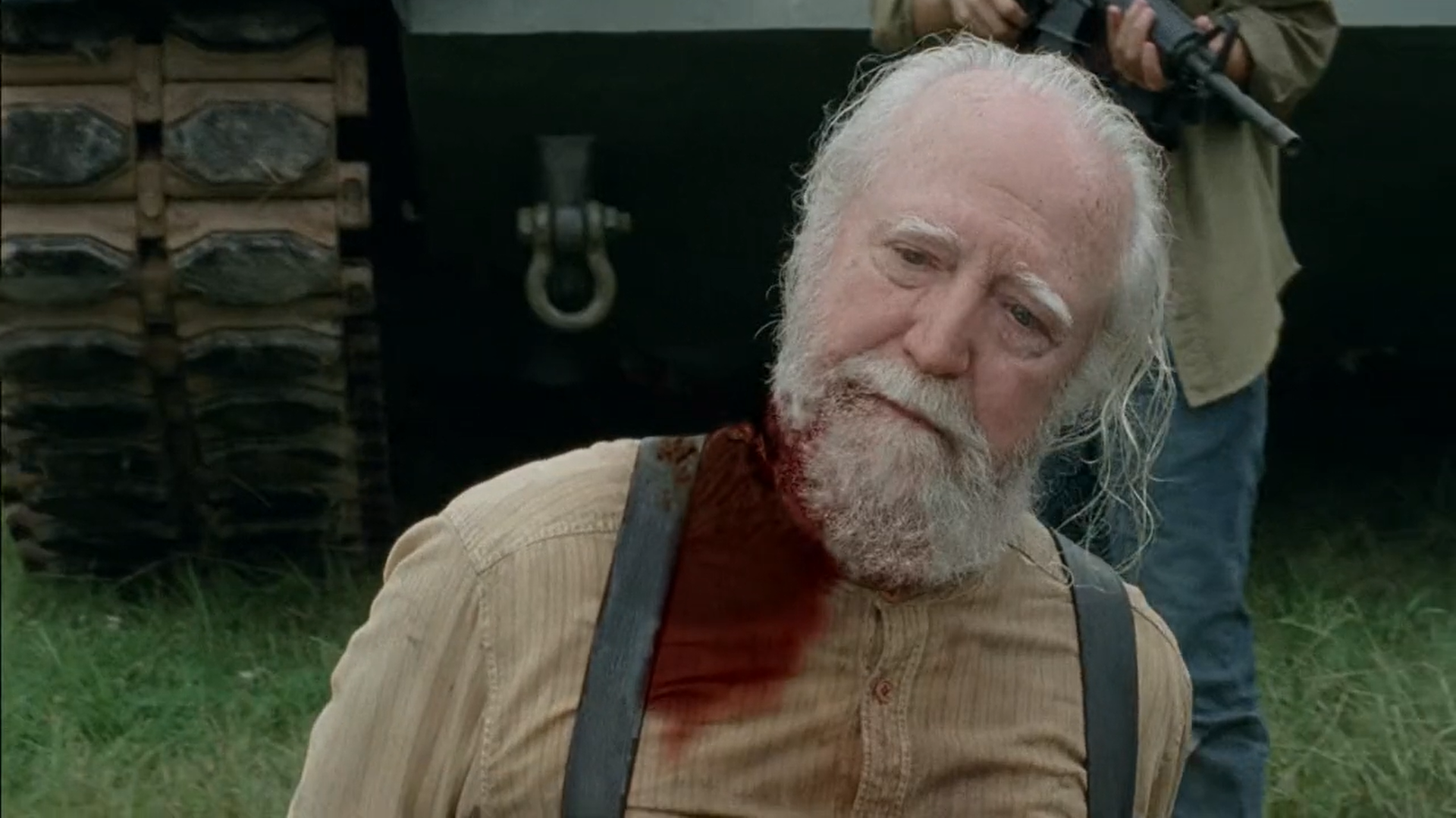 Hershel appears in this episode standing on his crutches, talking to Glenn as he mourns the deaths of Lori, and T-Dog. While Hershel believes that the two remaining prisoners, Axel and Oscar, are good people, Glenn believes that all of the prisoners should have been killed at first sight.