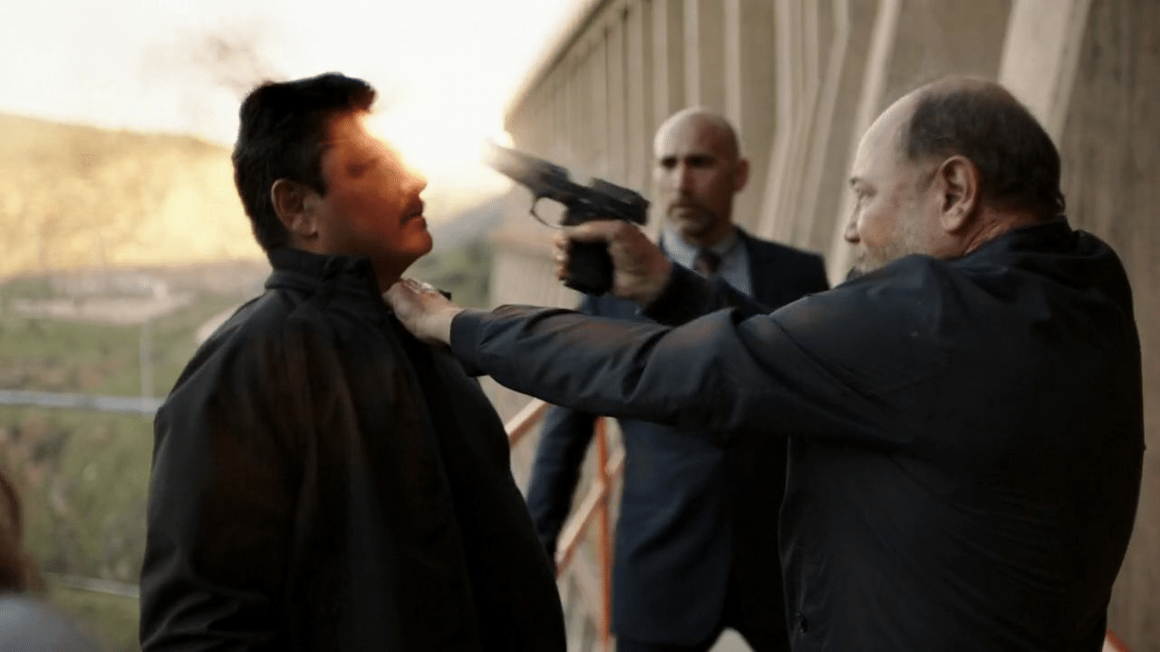Just as J.C. steps in to throw Lola over the dam, Daniel grabs J.C. and shoots him in the head.