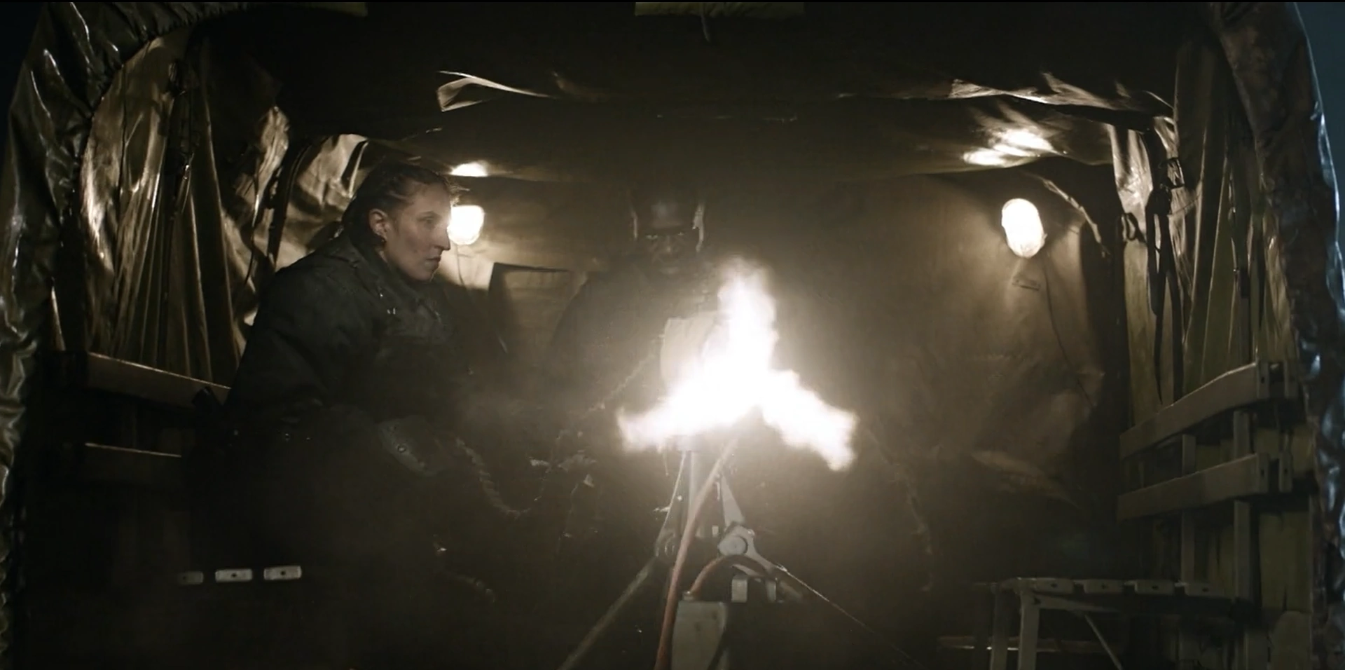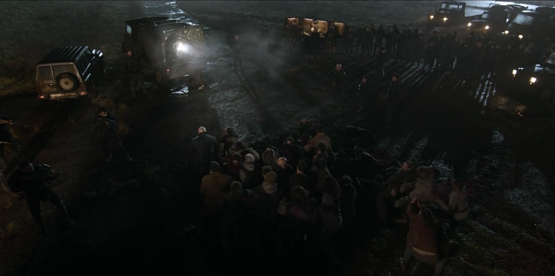 On the tidelands near the Nest, the Power of the Living prepares for battle, rolling two cannons past the lined-up selectees. Carol steps behind Jean for cover as a large machine gun is uncovered in the back of a truck. The crowd panics but is held at bay by Guerriers as Genet orders them all to be shot, but not in the head. The Guerriers manning the machine gun open fire, killing all but Carol, who throws herself to the ground and plays dead behind Jean's body. Henri LaFleur and several others quickly move in and begin firing darts full of Amper Serum into everyone before they can reanimate. Although one hits Carol, she quickly manages to pull it out before she can be injected. An ATV drives up with Stéphane Codron -- a bandage covering his left eye -- chained to the back of it to be used as a lure for the Ampers.