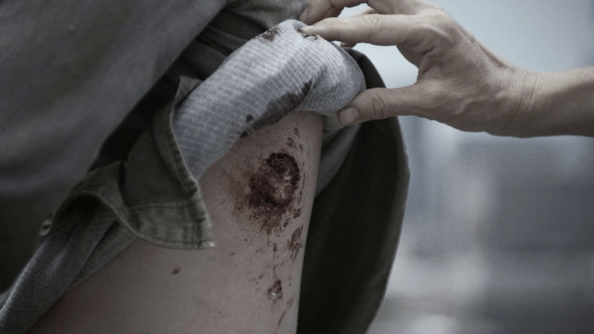When they reach the rooftop, Jim brags about his walker kill. June offers to check his wounds to get any glass out, but when she lifts his shirt, she reveals to him that he had been bitten in his short scuffle, and he reels from the shocking news and storms off.