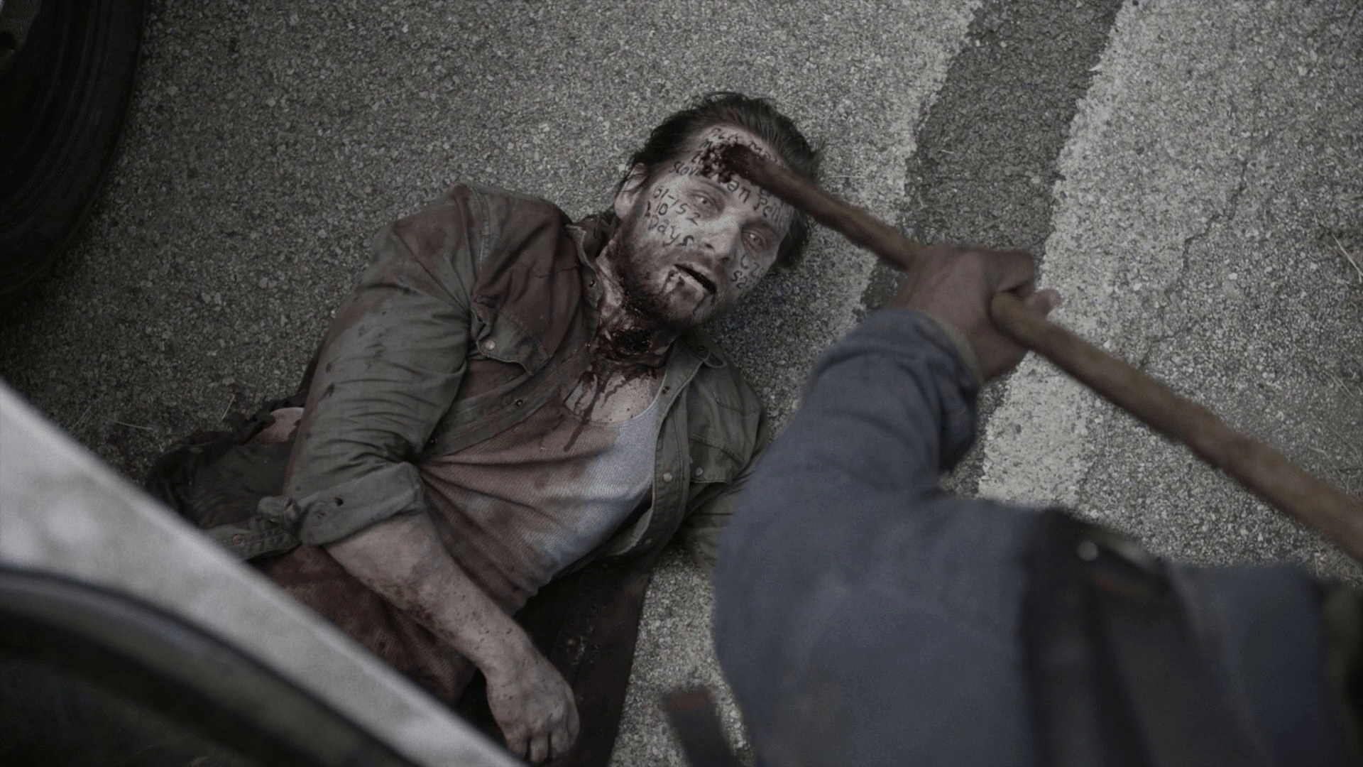 After finding a zombified Jim in the backseat of Martha's stolen police car, Morgan drags him out and impales him through the head with his staff, putting him down.