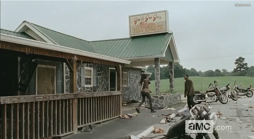 Carl and Rick walk on a country road with Carl walking ahead of Rick who struggles to keep up due to his injuries from the previous battle. At first, they stop by in a barbecue restaurant which seems to be looted already. A single walker is barricaded by some pieces of furniture. Rick wants to put it down with his ax, saving their bullets, but is too weak to make a killing blow forcing Carl to shoot it in the head despite Rick's pleas not to. On the floor, Carl notices a note left by the walker's son, who couldn't bring himself to kill his father. They scour the building for supplies and find a small haul. Carl was able to obtain more stuff and jokingly tells his father "I win".