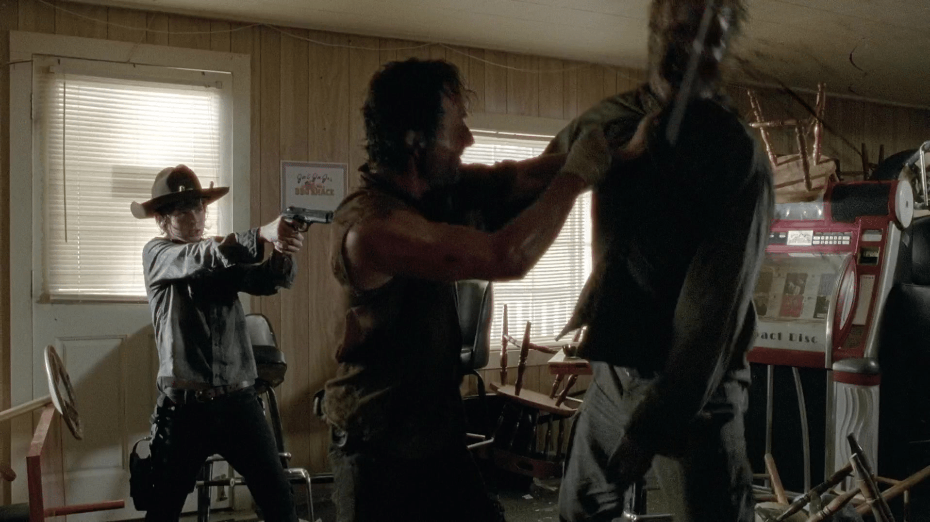 As Rick has his hatchet stuck in the zombified Joe Sr.'s head, Carl decides to shoot him in the back of the head.