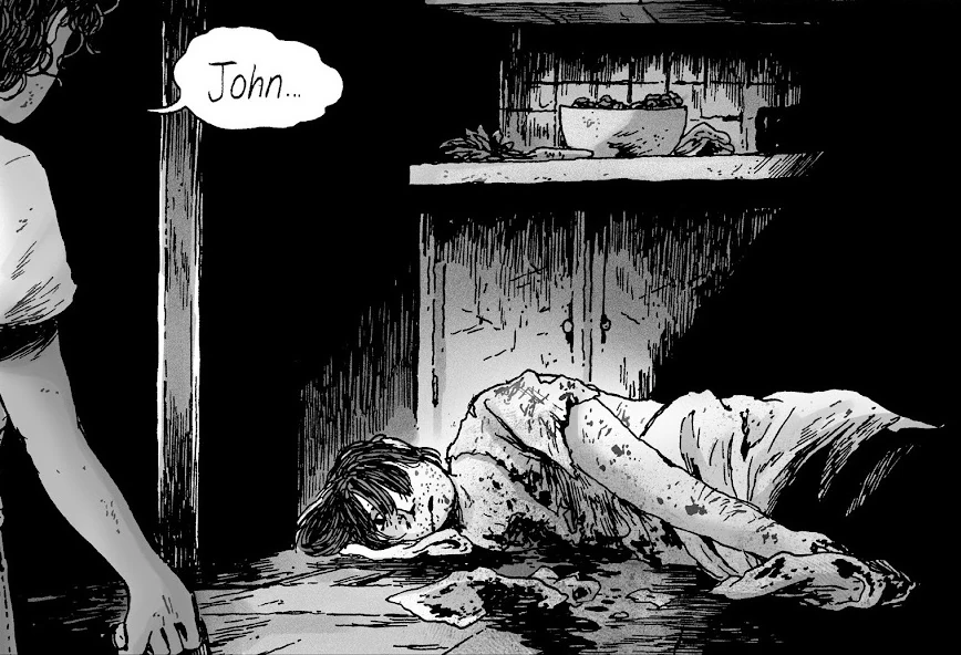 While attempting to kill zombies from the backlogs faster, John made the hole containing them bigger so more would come through, however they overwhelmed him and bite him on the chest. He makes it back to the house, where he dies from blood loss and shock and later reanimates.