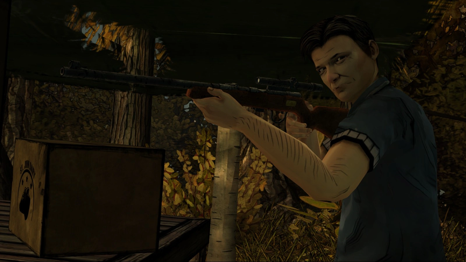 Lee and Danny encounter Jolene at her camp, where she erratically threatens them with her crossbow. After Jolene intimates that she knows Danny, she again threatens to kill them. Lee has the option of shooting her in the head. If he does not, Danny shoots her in the head before she can reveal how she knows Danny.