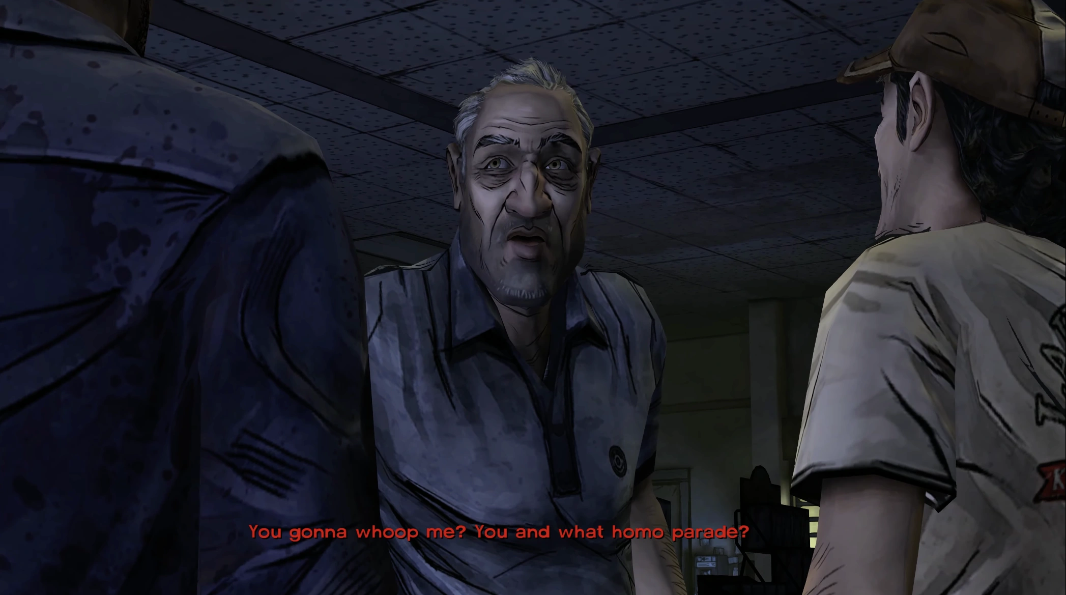 Season One"Goddammit Lily, you've got to control these people! (…) I don't give a flying fuck! We're in a warzone!" Son of a bitch, one of them is bitten! "Holy SHIT. Son of a bitch, one of them is bitten! (…) We let one in you stupid shits! We have to end this, now. (…) We'll dig one hole. (…) Don't you fucking people get it!? We've already SEEN this happen! We let someone with a bite stay and- and WE'LL all end up bitten! We gotta throw him out! Or smash his head in!" "Shut up, Lilly! And YOU. Shut the fuck up. They will find us and they will get in here. And none of this will fucking matter. But right now, we're about to be TRAPPED in here with one of those things. (…) He's bitten! That's how ya turn!" "You're gonna whoop me? You and what homo parade?" "Oh, I'm "upsetting" him? Upsetting is getting eaten alive!" "Look around, dumbass. I got a daughter in here, you got a daughter in here. Get your head out of your ass, boy." "Never woulda' happened. She's not some snot nosed toddler, okay? She's United States Air Force." "You're gonna whoop me? You and what homo parade? (…) HA, that's good. Little boy! Before you EAT your mommy, you can watch your dad get his nose broken." "Hey, I'm not the bad guy here. I'm just looking out for my daughter. (…) He's covered in muck! She'll find the bite, watch! (…) And if she does? First thing he'll do is sink his teeth into his mom's face. Then once she's dead, he'll probably pounce on your little girl. She'll turn fast and then they'll be three. And that boy is the ballgame." "You're not coming with us, you son of a bitch!" "FINALLY. Someone gets some sense. But we can't wait - we are tossing him out NOW! (…) Then it's settled." "We almost DIED because of this bitch and her itchy trigger finger! That was stupid! That was-" "You're not coming with us, you son of a bitch!" "I know who you are." "Lee, come here for a second. You like my daughter? (…) Well stay the fuck away from her. Or, uh, everyone will know that you, Lee Everett are a killer. And you were before it was something you had to do to stay alive. I know who you are, and I don't give a shit about what happens to you, but if anything happens to my daughter or that little girl you got with you, heh, you watch your ass." "Fine, huh? Well, just fuck you, Lee Everett. That's right. I know who you are and I know you're a killer. And you go near my daughter or step out of line once and so will everyone else." "Good. Stay away from her or everyone here knows that Lee Everett is a killer. And I'm not talking about those things out there. You hear me? (Lee shrugs) I asked you a question, boy. Then again, I wouldn't expect a convicted murderer to listen to anything anybody's got to say." "Well, the answer better be "no". Or, uh, everyone will know that you, Lee Everett, are a killer. And you were before it was something you had to do to stay alive." "I don't see any of you stepping up to make the hard decisions! My girl's got more balls than all of you combined!" "Hey, if Dough-Boy doesn't want his food, hand it this way. (…) Well, decide smart. You don't really want to piss me off, do ya?" "Will you hold the damn boards steady? (…) What do you want? A hand out? I've got 60 cents in my pocket if you'll shut up and quit being such a pansy." "I should shove this up your ass, but I'm too hungry." "That girl needs to quit worrying about me so much." "I hope you don't think this makes us friends." "HE- (groans) I just need some food. Going this long without a proper meal would make anybody cranky." "Oh, that's what you think this is? Is that what you told him? (…) And what are you gonna do about it? The only thing I "have" to do is protect my daughter. And right now, that means getting this damn wall fixed, so I'd appreciate it if you two would shut up and let me get back to work!" "You're out?! What happened to my food? (…) You keep treating people like this and your days in this group are numbered. (…) Yeah, well I don't see you working on that wall!" "Go piss up a flagpole, Lee." "Why'd you bring him here in the first place asshole!? You're gonna get us all killed!" "I've got charm coming out of my ass." "Good vibe? Well, Christ daddio, I'm sorry the folks with a food supply and defenses didn't tickle your pretty pink ass." "Whoa cool your jets there, Rambo. These are nice people. Let's not do anything to get us thrown out before we eat." "Well that's easy. I've got charm coming out of my ass." "So how does a woman like yourself run this whole place?" "So how does a woman like yourself run this whole place?" "You know, for a nice change of pace, how about you try minding your own fucking business?" "Sit your ass down, Lee. This lady has made you a meal. (…) He could use some goddamn manners. (…) Don't indulge him, Lilly. It's always something with this guy. " "Lee, sit down and eat your goddamn dinner. This woman made you a homecooked meal, you grateful shit! Show some respect! You don't even have the DECENCY to take a handout when you're offered one. It just makes me sick, it really does." "I will, and I'll enjoy every last bite!" "Open the god damned door! You can't keep us in here! OPEN UP! I WILL TEAR YOU FUCKERS APART WITH MY BEAR HANDS! You sick fucking bastards! OPEN THIS DOOR GODDAMMIT! I WILL KNOCK THE GODDAMN DOOR DOWN!" "If he woulda stopped us in time...!" "The rest of us did, God damnit! If you hadn't dragged your feet..." "That evil fucker INVITED me to eat the meat, and all the time he knew what it was!" "Yeah... THROUGH THIS FUCKIN' DOOR!" "This goddamn thumbsucker was the one who brought us here!" "God, you're worse than the walkers! I'll rip your goddamn heads off, and make you swallow them! There's more of us on the way! Let us out now! Do you wanna live? C'mon, show yourselves! Fucking cowards! You... you think the fucking apocalypse gives you the right to chop people into meat?! Fucking bastards!" "Yeah, I wanna to attract their attention so i can 