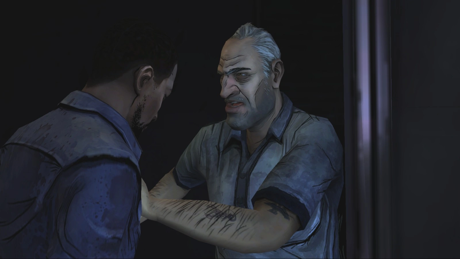 - At the beginning of "Starved For Help", Mark states that he "wouldn't want to be stuck in a room with him." This foreshadows the event where Lee, Clementine, Lilly, and Kenny are all locked in a meat locker with Larry.