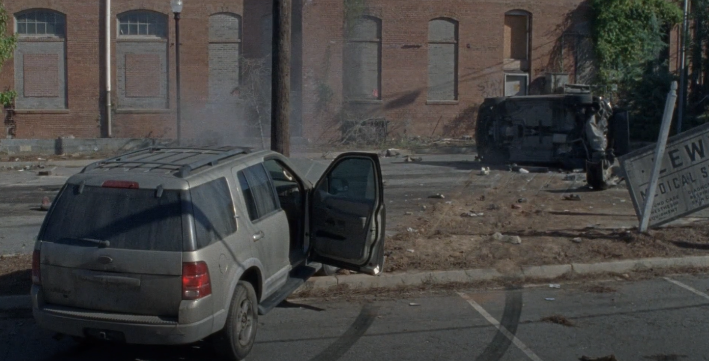 Simon and Dwight find Negan's wrecked car. They decide to abandon their search and return to the Saviors. Dwight lights the car on fire.