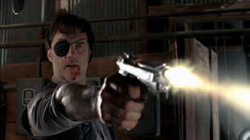 The Governor enters the room, after whispering something to Merle, who promptly exits. As he later takes the pair out to show them Woodbury, Merle demonstrates his role by climbing a fortified barricade and taking a rifle. He shows that he can still shoot a machine gun despite losing his hand, taking out three walkers in three shots.