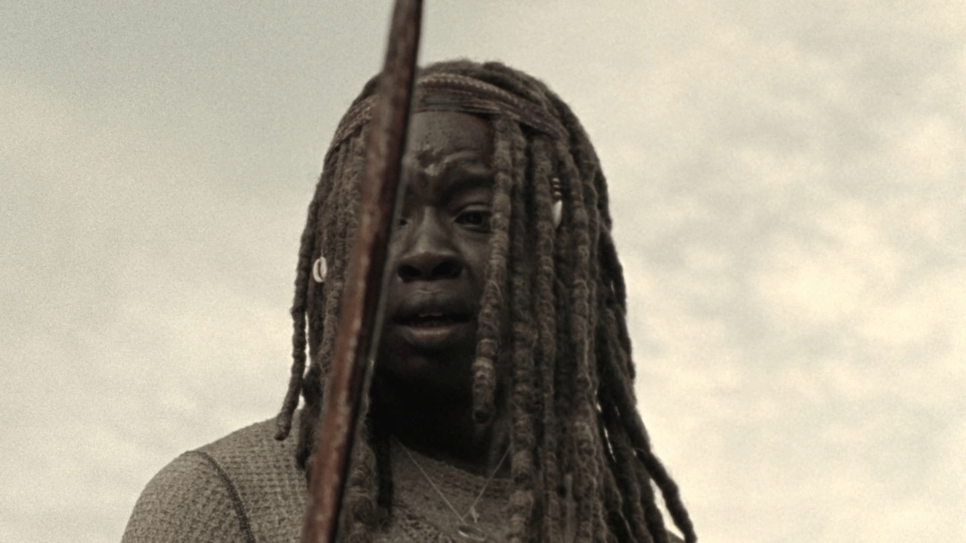 Mitchell tries to attack Michonne, but is quickly slashed in the stomach.