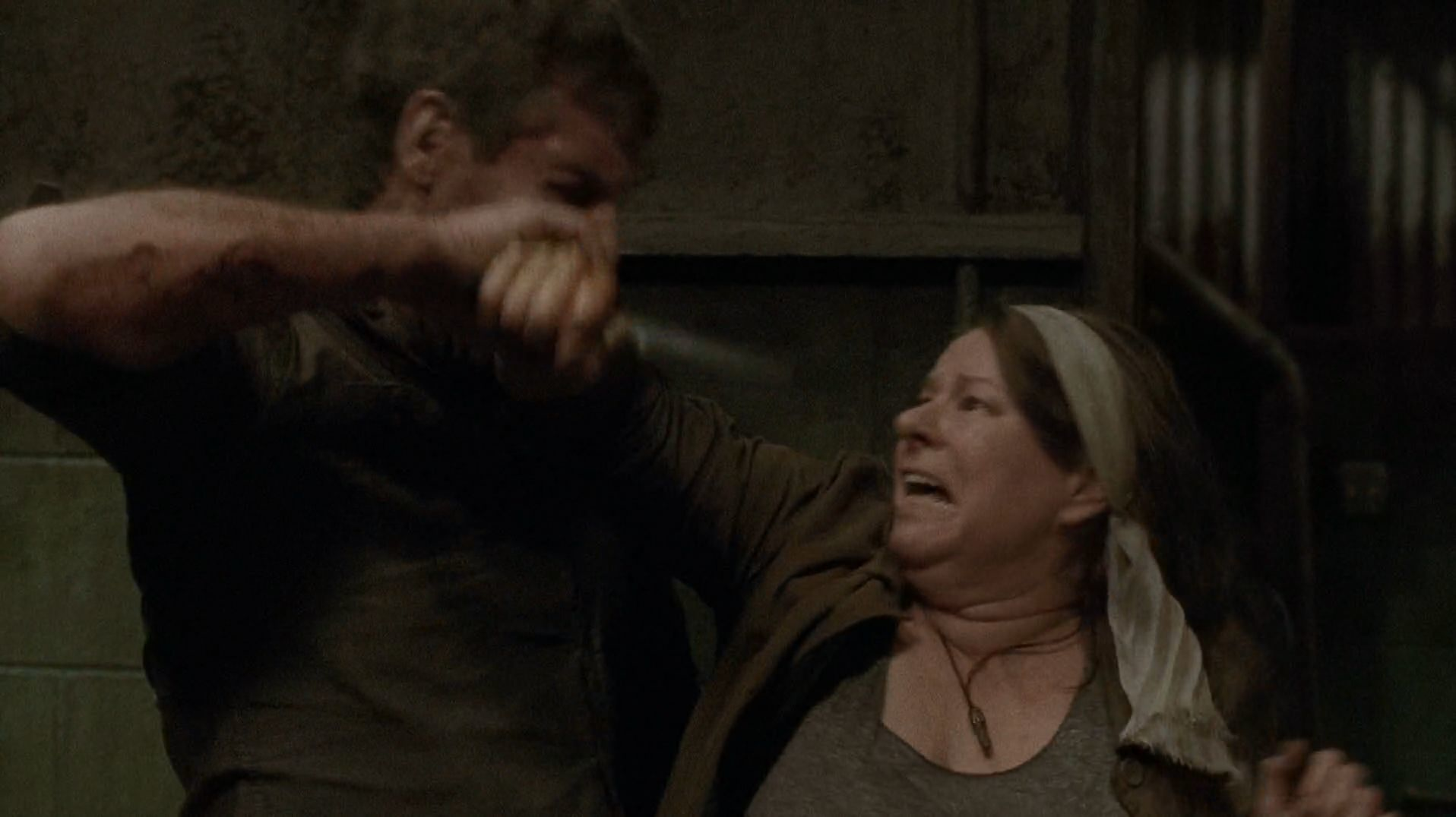 When Molly enters the room Carol is held in to check on her, she gets bitten in the arm by a zombified Donnie, who has died of blood loss and was tied by Carol to attack her.