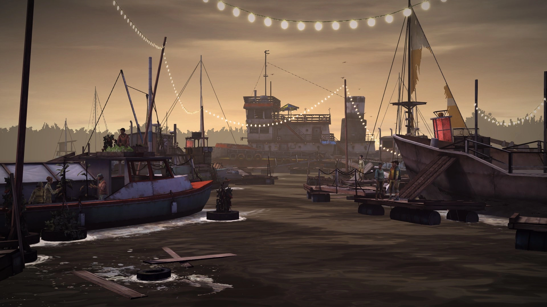 The three soon take cover in a boat, where they choose a getaway vehicle - a boat. Pete attempts to leave the boat in order to talk with the Monroe group, and Michonne has the choice to stop him. Nonetheless, the group battle through Monroe survivors, using a flare gun to start a fire. The fire begins to spread out of control as Samantha, Michonne and Pete (Determinant) make their escape.