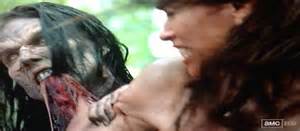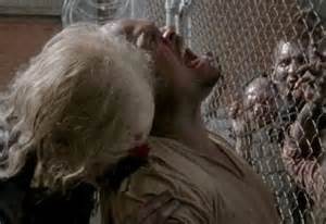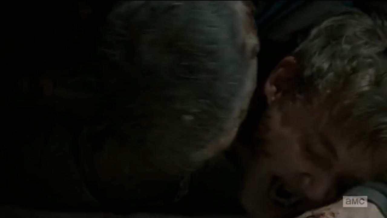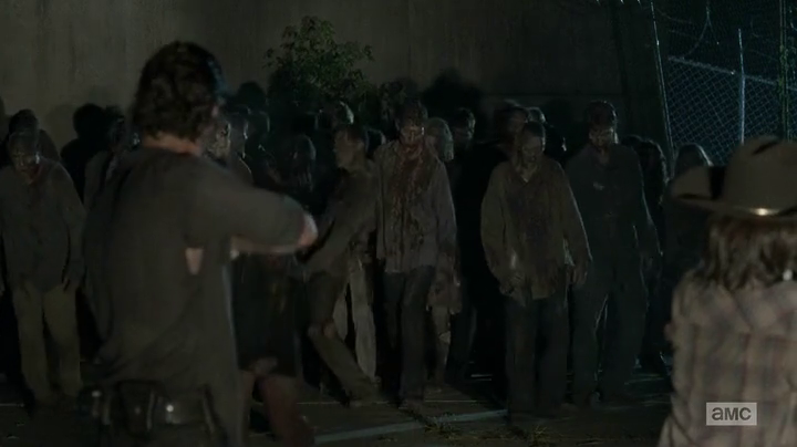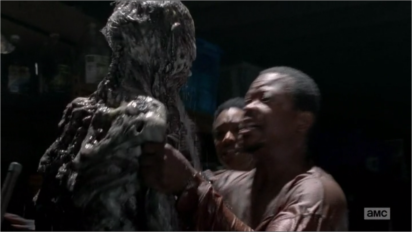 When the Wardens and Alexandrians are going through the subway tunnels during a storm to get to Meridian, Daryl finds this walker in a plastic bag and the walker tries to get Daryl. Daryl kills the walker and Roy asks why the walker made no noise. Gabriel says it's because his throat had been slashed very deep. It proves to be a part of a mass grave of walkers.