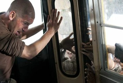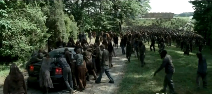 As Rick enters Atlanta, he runs into a massive herd of zombies downtown. As the walkers proceed to devour his horse, Rick attempts to escape and hides under a tank, on the verge of death he spots a escape hatch under the tank as the incoming walkers surround him.
