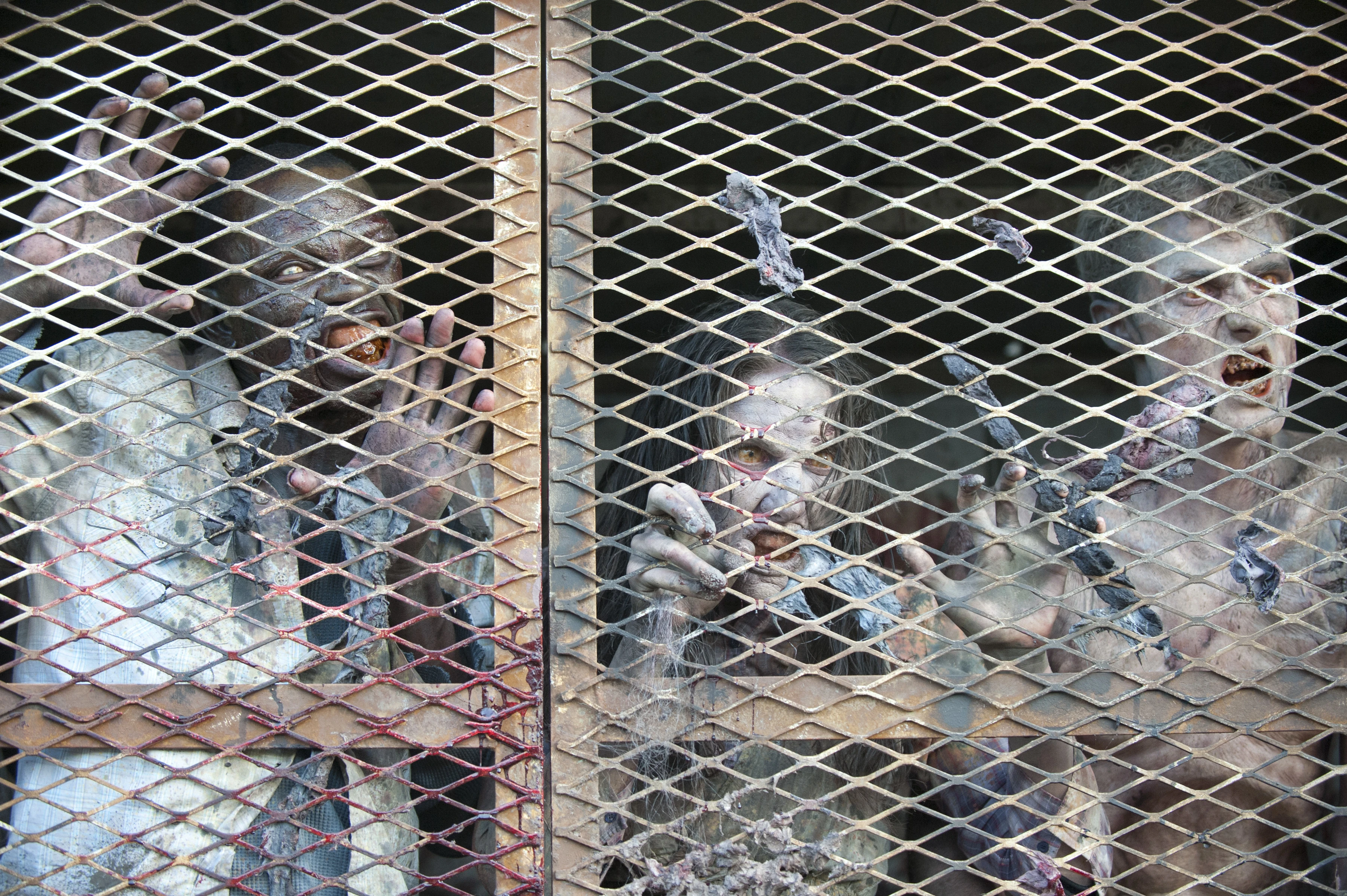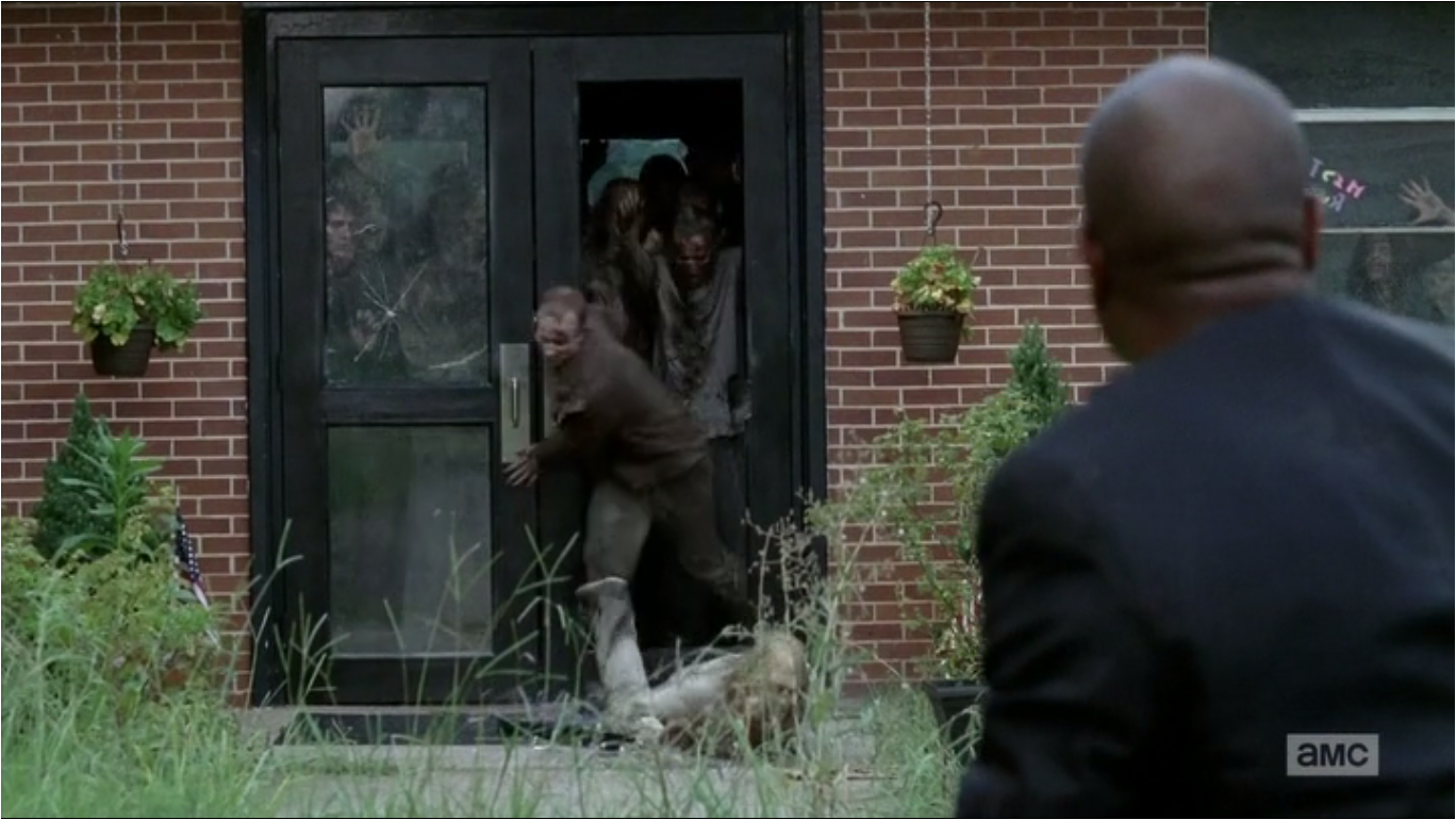 These walkers were the first walkers depicted using an object or tool: bricks, to break through a glass door to get to Rick and his group.