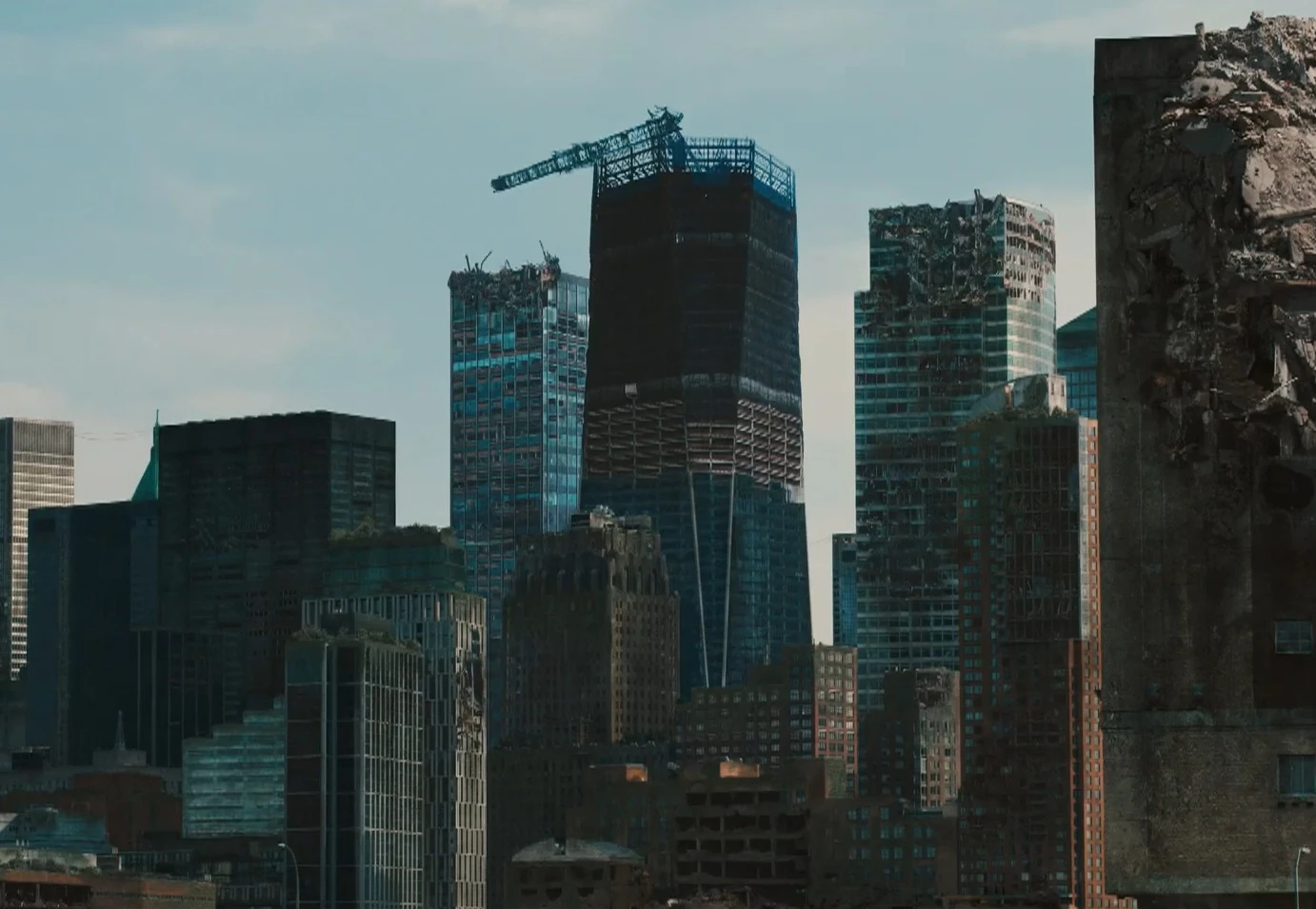 As Ginny reaches Manhattan, New York she looks out at the skyline and sees the unfinished building.