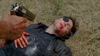 Later, Lilly finds The Governor lying on the ground, mortally wounded from being stabbed by Michonne. Lilly shoots him in the head, finishing him off.