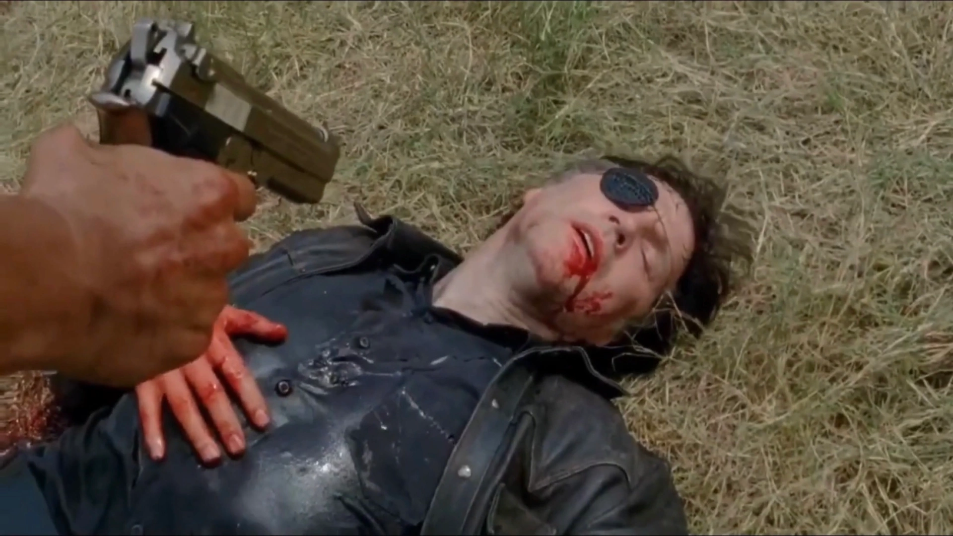 As The Governor beats up Rick, Michonne sneaks behind him and impales him through his back with her katana. However, she decides not to put him down and leaves him to die in agony.
